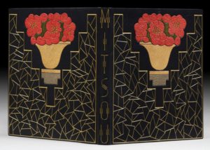 COLETTE Mitsou. Paris, Société nouvelle des Éditions d'art Devambez, 1930. In-4, maroquin bleu-nuit, sur chaque plat grand vase fleuri de maroquin beige, rose et vert, environné d'un décor géométrique au filet doré évoquant une mosaïque de carreaux irréguliers, dos orné du titre au filet doré écrit à la chinoise, roulette intérieure, doublure de cuir de Russie rose, gardes de soie brochée bleu nuit, tranches dorées sur témoins, couverture et dos, chemise demi-maroquin et à bande bleu nuit, étui (Max Fonsèque). Édition réalisée sous la direction artistique d'Édouard Chinot, ornée de 26 eaux-fortes et pointes sèches d'Edgar Chahine, dont 8 hors texte et une sur la couverture. Tirage à 226 exemplaires, celui-ci un des 120 sur vélin de Rives, fabriqué et filigrané spécialement, contenant les gravures dans leur état définitif. Exemplaire dans une intéressante reliure de Max Fonsèque, provenant de la bibliothèque Félix Marcilhac (2012, n°16)