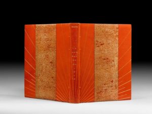 COLETTE La Naissance du jour. S.l. [Paris], Les XXX de Lyon, 1932. Grand in-4, demi-maroquin à bande orange, dos lisse portant le nom de l'auteur en capitales dorées et le titre au palladium, décor irradiant de filets or et argent naissant en bas du dos et courant sur une partie des plats, tête dorée, non rogné, couverture et dos, étui (Marot-Rodde). Jolie édition, illustrée de 97 lithographies originales de Luc-Albert Moreau dont un portrait de Colette. C'est l'un des beaux livres illustrés par l'artiste. Tirage à 120 exemplaires plus 15 hors commerce, celui-ci un des 60 sur japon impérial contenant une suite sur japon blanc à la forme. Exemplaire enrichi de 3 épreuves lithographiées tirées à 30 exemplaires et signées par l'artiste (les épreuves sont numérotées n°9/30) et de 4 lettres manuscrites signées de l'artiste à l'éditeur au sujet de l'illustration du livre. Reliure de Marot-Rodde, dont le décor irradiant s'harmonise bien avec le livre de Colette. Charnières un peu marquées au niveau des points de couture