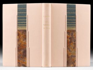 COLETTE La Naissance du jour. Paris, Ernest Flammarion, 1928. In-12, box rosé, plats divisés en deux parties par une bande verticale, constituée d'une pièce de peau gris-bleu et de papier marbré fantaisie, et bordée de trois listels gainés de même box, dos lisse portant le titre doré, doublure et gardes de feutrine, tête dorée sur témoins, non rogné, couverture, chemise et étui (Alain Devauchelle 1999). Édition originale. Un des 200 exemplaires sur hollande, second tirage en grand papier après 100 sur japon. Bel exemplaire