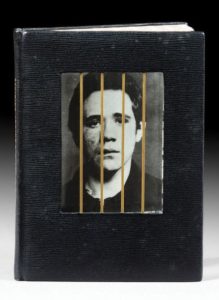 GENET (Jean) L'Enfant criminel & ‘Adame Miroir. Paris, Paul Morihien, 1949. In-8, maroquin noir à long grain, fenêtre découpée sur le premier plat avec quatre barreaux de métal laissant apparaître une photographie de Jean Genet dans sa jeunesse, dos lisse portant le nom de l'auteur et le titre en capitales dorées en long, tête peinte, non rogné, couverture et dos (Reliure moderne). Édition originale. Un des 50 exemplaires sur papier vélin Marais Crève-Cœur, seul grand papier. Complet de la bande-annonce, montée en tête du volume. La reliure donne toute sa puissance au texte de Jean Genet sur le «mystère des bagnes d'enfants»: Mettray, dans ma jeunesse, était parmi les noms les plus prestigieux [...], on l'enfermait [le jeune hors-la-loi] dans une cellule peinte entièrement (le plafond compris) en noir. [...] depuis toujours dans les bagnes d'enfants, dans les prisons de France, des tortionnaires martyrisent des enfants et des hommes