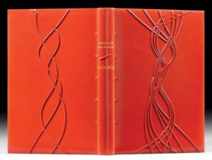 SARRAUTE (Nathalie) Enfance. Paris, NRF, Gallimard, 1983. In-8, box brique, jeu de multiples listels gainés en léger relief entrelacés sur les plats, dos lisse portant le nom de l'auteur et le titre en capitales dorées avec petit rappel du décor, filet doré intérieur, doublure et gardes de nubuck brique, tranches dorées sur témoins, couverture et dos, chemise demi-box à bande et étui (Renaud Vernier 1985). Édition originale. Récit autobiographique dans lequel Nathalie Sarraute (1900-1999) relate ses souvenirs d'enfance passée entre la Russie et la France. Un des 37 exemplaires sur vélin d'Arches, seul grand papier. Très élégante reliure de Renaud Vernier