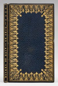 BAÏF (Jean-Antoine de). Mimes, enseignemens et proverbes. Paris, Pour Lucas Breyer, 1576. In-12, maroquin bleu à gros grains, dentelle droite dorée aux petits fers sur les plats, dos lisse portant le titre en long, mince roulette intérieure, tranches dorées (Thompson). Seconde édition, en partie originale : c'est la première édition complète des Mimes, comprenant huit pièces (la première, publiée la même année par Lucas Breyer, n'en contient que cinq). Elle est ornée, au verso du titre, d'un portrait du poète et humaniste, gravé sur bois. Ravissante reliure. De la bibliothèque du comte de Lanjuinais. Petite fente sans manque sur le bord du feuillet D5. Papier légèrement roussi. J. P. Barbier-Mueller, III, n°62. - Renouard, Breyer, n°26. - Diane Barbier-Mueller, Inventaire..., n°37.
