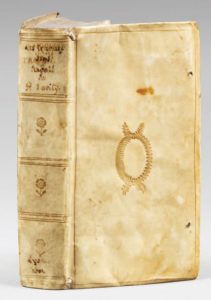 DAVITY (Pierre). Les Travaux sans travail. Avec le Tumbeau de Madame la Duchesse de Beaufort. Lyon, Thibaud Ancelin, 1601. In-12, vélin, filet doré, médaillon de feuillages doré au centre, traces de liens, dos lisse orné de filets et d'une fleurette répétée, tranches dorées (Reliure de l'époque). Seconde édition du premier recueil poétique de Pierre Davity (ou d'Avity), poète originaire de Tournon, en Vivarais, initialement paru en 1599 et dédié au duc de Vendôme. Précédé de pièces liminaires dues à des poètes dauphinois ou lyonnais, l'ouvrage comporte notamment deux petites histoires galantes, les dialogues La Courtisane mariée et La Belle dédaigneuse, 77 lettres missives, de nombreux sonnets, épigrammes, stances et épitaphes. On y trouve aussi deux charmantes pièces écrites pour la belette de Mademoiselle de Reynier : Petite follastre Belette, Bestelette follastrelette [...]. Gustave Reynier a souligné, dans Le Roman sentimental avant l'Astrée (p. 175, note 2), l'intérêt des lettres de Davity pour l'étude de la vie culturelle et mondaine de l'époque dans le Vivarais, le Dauphiné et la vallée de Rhône. Séduisant exemplaire, conservé dans son joli vélin doré de l'époque. Il a figuré au catalogue de la librairie Berès, Des Valois à Henri IV, sous le n°61. De la bibliothèque Genard (1882, n°192) (ex-libris endommagé). J. P. Barbier-Mueller, IV-1 n°79. - Lachèvre, Recueils collectifs de poésies, t. I, p. 159. - Diane Barbier-Mueller, Inventaire..., n°143.