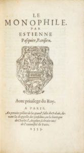 PASQUIER (Étienne). Le Monophile. Paris, [Benoît Prévost pour] Charles L'Angelier, 1555. In-8, …