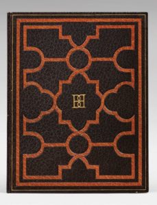 RONSARD (Pierre de). Institution pour l'Adolescence du Roy treschrestien Charles neufiesme de ce nom. Paris, Gabriel Buon, 1564. Plaquette in-4 de 6 pages (la dernière non chiffrée), maroquin brun, plats encadrés d'un filet doré et orné d'un décor à la fanfare vide mosaïqué de maroquin fauve, chiffre doré au centre, titre doré en long au dos, filet intérieur à froid, tranches dorées, étui (G. Plumelle). Nouvelle édition, après l'originale publiée chez Gabriel Buon deux ans plus tôt. Discours en vers composé en 1562 pour le roi Charles IX, alors âgé de onze ans, dans lequel Ronsard entendait éclairer le jeune monarque comme le firent auparavant Érasme pour Charles-Quint et Budé pour François Ier. Jolie reliure à la fanfare à compartiments vides mosaïquée, au chiffre du collectionneur. J. P. Barbier-Mueller, II-1, n°40. - J. P. Barbier-Mueller, Discours politiques, n°19. - Diane Barbier-Mueller, Inventaire..., n°717.