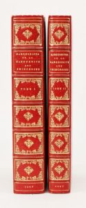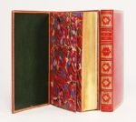 (1547). MARGUERITE DE NAVARRE. MARGUERITES DE LA MARGUERITE DES PRINCESSES. Lyon, Jean de Tournes 1547. 2 volumes in-12 de 541-[2] et 342-[2] pages, maroquin rubis, triple filet doré, dos à nerfs richement ornés, doublure de maroquin émeraude, double garde, tranches dorées (M. Godillot). Edition la plus recherchée de ces poésies, «dont les exemplaires bien conservés sont rares» dit Brunet. Elle fut publiée par Jehan de la Haye, valet de chambre de la Reine. Le miroir de l'Ame pécheresse et la fable du faux Cuyder, contenant l'histoire des Nymphes de Diane avaient seuls été publiés antérieurement. Le conte intitulé «La coche» est illustré de 10 vignettes (45 x 71) de Bernard Salomon. «La première figurant une assemblée de seigneurs et de dames, dans un paysage étendu, est un chef-d'œuvre de la gravure sur bois par la finesse étonnante des tailles, la science des feuillages, l'équilibre des plans...» (Brun). Très bel exemplaire à grandes marges (H. 168 mm) dans de parfaites reliures de Marcel Godillot, ouvrier chez Marot-Rodde, puis installé à Paris de 1938 à 1975. (Tchémerzine IV, 366) (Rothschild n°626) (Cartier n°105) (Mortimer French, n°365. Tirage A.) (Brun, le livre ill. p. 245).