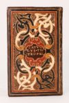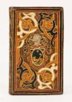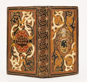 (1548). CATULLE - TIBULLE - PROPERCE. HIS ACCESSERUNT CORN. GALLI FRAGMENTA. Lyon, Sébastien Gryphe, 1548. In-16 de 336 pages, plats entièrement recouverts d'un décor de listels à la cire blanche, bleue citron et rouge formant des compartiments à décors géométriques sur fond de pointillés dorés, avec armoiries également mosaïquées au centre des plats, dos lisse mosaïqué entrecoupé de pointillés, tranches dorées et ciselées (reliure ancienne avec décor postérieur). Jolie impression italique lyonnaise, réglée avec d'abondantes annotations manuscrites de l'époque dans la première partie. L'exemplaire est entièrement réglé en rouge. Étonnante et rare reliure dont le riche décor à la cire peut avec certitude être attribué à THEODORE HAGUE, (1823-1891) faussaire qui s'était fait une spécialité dans ce domaine. Il dupa un grand nombre d'amateurs, dont le richissime américain John Blacker qui acheta nombre de ces reliures truquées sans le savoir ! Une grande partie de sa bibliothèque fut dispersée à Londres en 1897 par son fils. Bel état. (Baudrier VIII, 220) (USTC, 149939).