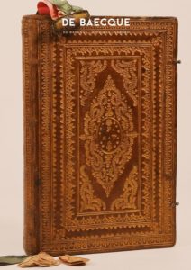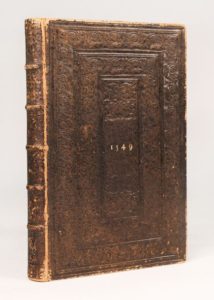 (1549). ALCIAT. EMBLEMES, DE NOUVEAU TRANSLATEZ EN FRANÇOIS VERS POUR VERS IOUXTE LES LATINS. Lyon, Guillaume Rouille, 1549. In-8 de 267-[5] pages, veau noir, plats estampés à froid à la manière du XVI°, dos à nerfs, tranches rouges (Petit, succ. de Simier). L'une des plus belles éditions des emblèmes d'Alciat. Célèbre recueil de quatrains illustrés qui connut une vogue extraordinaire au XVI° siècle et dans lequel les artistes du moment venaient y puiser les interprétations allégoriques des symboles. Cette édition lyonnaise est illustrée d'un grand encadrement architectural au titre et de 200 JOLIES FIGURES NON SIGNEES; ces dernières remarquablement gravées sur bois sont plus grandes que ceux des éditions antérieures et placées dans de grands encadrements baroques. Le traducteur Barthélémy Aneau a rangé ces emblèmes par lieux communs et indique dans la préface: «Chacun aura dans ce petit livre, tout ce qu'il vouldra inscrire ou pindre aux murailles de la maison, aux verrières, tapis, couvertures, tableaux, images, tables, licts, brief à toutes pièces ou ustensiles en tous lieux.». Cet exemplaire porte bien le carton page 178 indiqué par Baudrier. Quelques emblèmes ont été coloriés, un cahier a été placé tête en bas à la reliure. Charnières fragilisées. (Baudrier IX, 158. «Edition la meilleure comme tirage des vignettes») (Rothschild II, 354) (USTC 6230) (Mortimer French n°15).