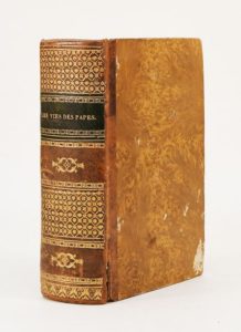(1551). PLATINE (Baptiste). LES VIES, FAICTZ ET GESTES DES SAINCTZ PERES, PAPES, EMPEREURS ET ROYS DE FRANCE. Paris, Vivant Gaultherot, 1551. Fort in-8 de [18]-462 (476 feuillets (mal chiffrés), demi-veau, dos lisse orné, tranches rouges (reliure du XIX°). Traduction française illustrée de 228 MEDAILLONS sur bois dans le texte figurant les papes, un pour chaque pape. «Les vies des papes de Platine sont écrites avec élégance et elles renferment certaines particularités assez remarquables» (Brunet). Feuillets rognés court en tête, nombreuses erreurs de pagination. (Brunet, IV, 693) (USTC, 37887).