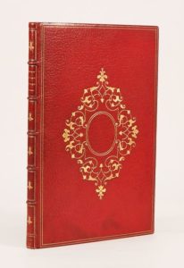 (1555). TYARD (Pontus de). SOLITAIRE SECOND OU PROSE DE LA MUSIQUE. Lyon, Jean de Tournes, 1555. In-4° de 160-[16] pages, maroquin rouge, large motif doré au centre des plats, double filet doré, dos à nerfs orné, dentelle dorée intérieure, tranches dorées sur marbrure (Hardy-Mennil). Cet ouvrage n'est pas, comme on pourrait le croire, une suite du Solitaire premier qui renferme des poésies mêlées. Le Solitaire Second est un traité spécial sur la musique. Dédicace de Maurice Scève placée en regard du beau portrait de Pontus «gravé avec une largeur et une souplesse remarquable par le Petit Bernard» (Cartier) et quelques planches techniques dessinées par l'auteur. La planche dépliante renferme une gravure sur bois représentant le monocorde, instrument «Moyennant lequel, les consonnances différentes sont connues sur diferentes proporcions». Petites taches claires sur le plat sinon bel exemplaire relié avec soin dans le goût de l'époque. Ex-libris armorié non identifié. (Tchemerzine V, 892) (Cartier n°318) (Brunet V, 853) (USTC 39158).