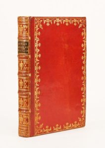 (1556). [GUEVARA (Antoine de)]. DECADE CONTENANT LA VIE DES EMPEREURS... Paris, M. de Vascosan, 1556. Petit in-4° de [4]-243 feuillets, maroquin rubis, large dentelle dorée encadrant les plats, dos nerfs orné d'urnes dorées, tranches dorées (reliure du XVIII°) EDITION ORIGINALE. Les dix biographies d'empereurs romains, extraites de plusieurs auteurs grecs, latins et espagnols paraissent ici pour la première fois dans la traduction française d'Antoine Allègre (1500-1570). Ce volume se joint ordinairement aux Vies des Hommes illustres de Plutarque. «Edition magnifique, les exemplaires en sont rares» (De Bure, bibliographie instructive p. 432). Bel exemplaire en maroquin orné (Brunet IV, 737) (USTC, 37692, 9 ex. recensés).