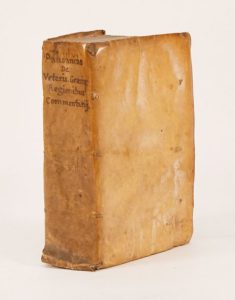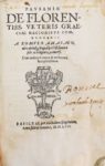 (1557). PAUSANIAS. DE FLORENTISS. VETERIS GRAECIAE REGIONIBUS. Bâle, Michael Isengrin, 1557. In-8° de [16]-802-[138] (sur 140) pages, velin souple (reliure de l'époque). Quatrième édition éditée par Romolo Amaseo (1489-1552), humaniste italien à qui l'on attribue la première traduction complète des œuvres de Pausanias en latin et qui est dédiée au cardinal Farnèse. Cernes clairs à l'angle des feuillets, le dernier feuillet avec la marque d'imprimeur manque. Ex-libris manuscrit Jacobi Roselli. (USTC 683335).