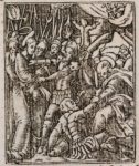 (1560). BIBLIA. TESTAMENTI NOVI. Editio vulgata. Lyon, héritiers de Sébastien Gryphe, 1560. 2 tomes en 1 vol. fort in-16 de 477-3bl.-333-1bl.-[16(sur 20] pages, reliure moderne avec velin ancien. Reprise de l'édition donnée pour la première fois par Sébastien Gryphe en 1542; elle est illustrée de 105 BOIS dans le texte dont 3 (Mathieu, Luc et Jean) portent le monogramme I.F, et paraissent être l'œuvre de Johan Franck d'après Baudrier, de Jacques Faber d'après Vogelin, de Jean Froben d'après Didot. Le dernier feuillet (marque de l'imprimeur?) manque. (Baudrier, VIII, 299) (USTC 153017, 3 ex.) (Mortimer French n°90).