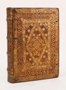 (1567). ARIOSTE. CON CINQUE NUOVI CANTI DEL MEDESIMO. Ornato di figure ORLANDO FURIOSO... Venise, Gio. Andrea Valvassori detto Guadagnino, 1567. In-4° de [16]622-[70] pages, maroquin rouge, plats ornés d'un large décor composé d'un double cadre avec canards et chèvres dorées alternés, et d'un losange-rectangle orné de rinceaux et de fleurons dorés, dos à nerfs orné de filets et de fleurons dorés, tranches dorées et ciselées (reliure de l'époque). Belle édition vénitienne imprimée sur deux colonnes en caractères italiques et ornée sur le titre d'un cadre architectural, d'un portrait de l'auteur et de 51 REMARQUABLES FIGURES sur bois placées dans des cartouches ornementés dans le texte. La partie «Cinque Canto» avec sa propre page de titre et en pagination continue est datée de 1566. Petites taches d'encre sur une page, ex-libris manuscrit caviardé au titre. Petits accidents, sinon belle et riche reliure vénitienne du XVI° siècle, légèrement fanéee. (USTC, 810746).