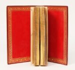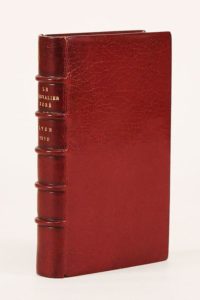 (1570). LA PLAISANTE ET AMOUREUSE HISTOIRE DU CHEVALIER DORE ET DE LA PUCELLE SURNOMMEE CUEUR D'ACIER. Lyon, François Durelle pour Benoît Rigaud, 1570. In-16 de 176 feuillets non chiffrés, maroquin janséniste cassis, dentelle dorée intérieure encadrant une doublure de maroquin de même teinte, double garde, tranches dorées sur marbrure (Joly, r.d.). Volume de la plus grande rareté. C'est un roman tiré de Perceforest (représenté sous le nom de Péléon) afin de "rafraîchir" le sujet. Troisième édition illustrée DE 40 CHARMANTES VIGNETTES finement gravées sur bois très proches (mêmes dimensions: 50 x 32) de celles de l'Hécatongraphie et donc de facture plus parisienne que lyonnaise. Très bel exemplaire en maroquin doublé de Robert Joly, employé chez Gruel puis installé à la suite de son père à Paris au début du XX° siècle. (Baudrier III, 268, coll. erronée) (USTC 31227, 1 ex. de 1577) (Brunet IV, 686).