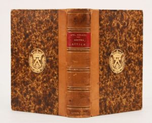 (1571). AULU GELLE. NOCTES ATTICAE. Lyon, Barthélémy Vincent, 1571. In-8 de [64]-575 pages, demi-veau blond, dos à nerfs, armes dorées sur les plats (reliure du XIX°). Jolie édition lyonnaise des nuits attiques, complétée par un double index assez ample avec l'explication des passages grecs. Ex-libris manuscrit Franciscus Denyau. Bel exemplaire aux armes d'Adélaïde-Edouard Le Lièvre de La Grange (1796-1876), diplomate. (O.H.R., pl. 297, cite cet exemplaire).