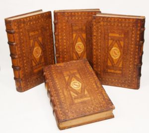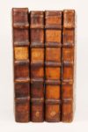 (1573). ESTIENNE (Robert). THESAURUS LINGUAE LATINAE. Lyon, (Compagnie des libraires), 1573. 4 volumes in-folio de [12]-1362-[4]-752-[4]-449-[34] pages, ais de bois recouverts de veau fauve estampé à froid, larges encadrements de fers et fleurons pleins, multiples filets et roulettes, losange central avec médaillon et armoiries dorés avec bande à la cire rouge chargée de trois croissants d'or, le tout entouré de la devise : Non auro sed ferro, renforts métalliques, traces de fermoirs, (reliure de l'époque). C'est dans cette quatrième édition, faite aux frais de la grande compagnie des libraires de Lyon, qu'apparaissent pour la première fois les annotations et les notes d'Henri Estienne, fils de Robert. On les retrouvera ensuite dans l'édition bâloise du 18ème siècle. EXEMPLAIRE AUX ARMES DE LA FAMILLE VAN DEN DAELE de Flandre-Brabant enrichi d'épreuves du portrait d'Alvarus Nonius, médecin anversois, gravé par J. Wierix, en 1586, collées sur les gardes en regard des 4 titres. De la bibliothèque de Sir Andrew Fletcher of Saltoun (1653-1716), grand patriote écossais et l'un des plus éminents bibliophiles britanniques avec sa signature autographe sur les titres. Rousseurs et quelques traces de mouillures. Angles des feuillets paginés 1145-1148 du second volume découpés, sans toucher le texte. Importantes restaurations aux dos. La dorure des armes semble avoir été rétablie postérieurement. (Renouard, 57) (Brunet II, 107) (Baudrier VI, 460).