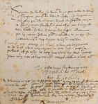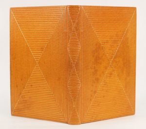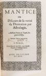 (1573). TYARD (PONTUS DE). LES OEUVRES POETIQUES de Pontus de Tyard, seigneur de Bissy, à scavoir trois livres des erreurs amoureuses. Un livre des vers liriques, plus un recueil des nouvelles oeuvres poétiques. Paris, par Galiot du Pré, 1573. [8]-164 pages - Ponti Thyardei, Bissiani, ad Petrum Ronsardum, de Coelestibus alterismis Poëmatium. Parisis, Galéotum à Prato, 1573. 4 feuillets - Recueil des nouvelles oeuvres poétiques de Pontus de Tyard. s.d. 20 feuillets - Solitaire premier ou dialogue de la fureur poétique. Seconde édition. Paris, Galiot du Pré, s.d. [4]-68 pages - Mantice ou Discours de la vérité de divination par Astrologie. Seconde édition. Paris, Galiot du Pré, s.d. [4]-114-[1]-1bl. pages. 5 parties reliées en 1 volume in-4°, maroquin safran, plats ornés d'un décor radiant formé de petits filets dorés parallèles et se rétrécissant vers le centre, dos lisse orné de même, double filet doré intérieur, doublure de veau, tranches dorées (Richard). PREMIÈRE ÉDITION COLLECTIVE, EN PARTIE ORIGINALE, des OEuvres poétiques du poète, membre de la Pléïade, Pontus de Tyard (1521-1605). Elle est dédiée « à une docte et vertueuse Damoiselle », qui serait la comtesse de Retz. Bel et rare exemplaire de ces différents recueils poétiques de Pontus de Tyard, l'un des meilleurs poètes de la Pléiade. Le poème latin De coelestibus asterismi (opuscule de quatre feuillets qui manque parfois), paraît ici pour la première fois. Il est rare de trouver ces différents volumes réunis. Exemplaire enrichi d'un billet dont une partie est rédigée et signée par Pontus de Tyard: «Envoies moy quinze ou vingt ecus par Lesperaux et je les vous les allouerai sur cette lettre avec sa quittance et aussi le drap que vous lui ferez donner pour un accoustrement..... Votre bien affectionné amy, Pontus de Tyard, Anc. E. de Chalon». (Après avoir abandonné sa charge d'évêque en 1589, Pontus de Tyard s'était retiré sur ses terres de Bragny-sur-Saône où il mourut. Il possédait les terres et le château de Bissy-sur-Fley.) Mention manuscrite en bas du titre du collège des jésuites de Chaumont. «Collegii Calvomontani catalogo inscriptus, Dono R.P. Francesci Matthieu, 1684». Le relieur est probablement de Raphael Richard, actif de 1935 à 1963, successeur de son père à Paris. Piqûres sur les plats. (Fléty, p. 152) (Tchemerzine V, 897) (Barbier Muller, Inventaire n°865-66) (USTC, 1553).