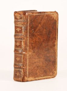 (1574). ALCIAT (André). EMBLEMES D'ALCIAT, EN LATIN ET FRANÇOIS VERS POUR VERS. Augmentez de plusieurs Emblemes en latin dudict autheur, traduictz nouvellement en françoys. ordonnez par lieux communs, avec briesves expositions, & enrichis de plusieurs figures non encores imprimées par cy devant. Avec la table d'iceux mise à la fin. Paris, de l'imprimerie de Hierosme de Marnef, et Guillaume Cavellat, 1574. In-16 de 332-[12] pages, veau brun, filets dorés, dos à nerfs orné (reliure de l'époque). Célèbre recueil de quatrains illustrés qui connut une vogue extraordinaire au XVI° siècle et dans lequel les artistes du moment venaient y puiser les interprétations allégoriques des symboles. C'est la première édition des commentaires français de Claude Mignault, dit Minos, sur les emblèmes d'André Alciat, célèbre jurisconsulte milanais. Un feuillet blanc final porte la marque de Sébastien Gryphe? Cette édition parisienne est illustrée de 195 JOLIES FIGURES DU PETIT BERNARD avec à la suite 14 autres planches représentant des arbres: le chêne, le saule, le laurier, le cyprès, etc. Une charnière fendue, petit manque en haut du f. 245, qq. taches et petits cernes. (USTC 6231, 10 ex.) (Duplessis n°39).