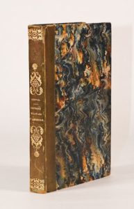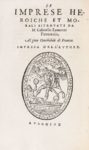 (1574). GIOVIO (Paolo). DIALOGO DELL' IMPRESE MILITARI ET AMOROSE... Lyon, G. Rouille, 1574. In-8 de 280-[14] pages, demi-veau olive, dos lisse orné (reliure du XIX°). Edition lyonnaise ornée du portrait de Giovio et de 138 GRANDES FIGURES EMBLEMATIQUES gravées sur bois par Le Maître à la Capeline, de forme ovale avec les devises incorporées dans les images, dans un ruban flottant. 102 pour Giovio et 36 pour Syméoni, y compris celle du titre. Un mors fendu, cernes angulaires. (Brunet III, 583) (Baudrier XI, 348) (USTC, 833256) (Landwher, Romanic, 345).