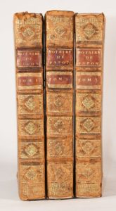 (1576-80). PAPON (Jean). INSTRUMENT DU PREMIER NOTAIRE. (1576) - TRIAS JUDICIEL DU SECOND NOTAIRE (1580) - SECRETS DU TROISIEME ET DERNIER NOTAIRE. (1578). Lyon, Jean de Tournes, imprimeur du Roy, 1576-80. 3 volumes in-folio, basane, dos à nerfs orné, tranches rouges (reliure du XVII°). Jean Papon, ami d'Honoré d'Urfé et Lieutenant Général de Montbrison, fut représenté dans L'Astrée sous les traits du druide Adamas. Célèbre jurisconsulte, il devint Maître des Requêtes de Catherine de Médicis en 1529 et fut anobli par Henri III en 1578. Belles impressions de l'officine lyonnaise de Jean de Tournes, agrémentées de nombreuses lettrines à fond criblé. Défauts aux reliures, quelques taches et rousseurs. (Cartier, 576 - 590 - 609).