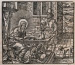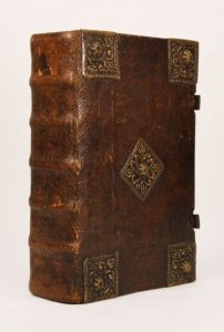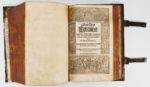 (1582). BIBLE - [DIETENBERGER (J)]. BIBEL. TRANSLATION TREWLICH VERTEUTSCHT, UND MIT VIELEN HEILSAMEN ANNOTATEN ERLEUCHTTET, DURCH D.JOHAN DIETENBERG... Köln, G. Calenius et J. Quentel Erben 1582. 2 parties de [6]-450 et 138 feuillets en 1 fort volume in-folio, veau brun estampé sur ais de bois, plats ornés d'un large cabochon central et écoinçons cloués et ciselés en cuivre aux angles, dos à nerfs orné des mêmes motifs que les plats, lanières de cuir et fermoirs en cuivre, tranches rouges (reliure de l'époque). Fameuse Bible «Anti-Luthérienne» dans la traduction de Johann Dietenberger qui est la première Bible catholique allemande imprimée en Europe; elle fut publiée pour la première fois en 1534. Son abondante illustration se compose de 136 BOIS (56 x 65 mm) répartis dans le texte dont beaucoup portent le monogramme VD, probablement des recoupes d'illustrations de Solis pour des éditions bibliques précédentes. Le premier titre est refait à la plume, celui de la seconde partie avec son encadrement est bien présent. Mouillures, réparations en marge sur qq. feuillets, le 148 avec manque de lettres, le 348 déchiré sans manque. La reliure est en belle condition. (Darlow/Moule 4211).