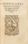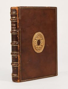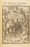 (1584). OVIDE. LA VITA ET METAMORFOSEO D'OVIDIO. Figurato et abbreviato in forma d'Epigrammi da M. Gabriello Symeoni. Con alte Stanze sopra gl'effetti della Luna : il ritratto d'una Fontana d'Overnia : et un'Apologiagenerale nella fine del libro. Lyon, Jean de Tournes, 1584. In-8 de 245-[59] pages, veau brun, médaillon doré Renaissance au centre des plats, filet doré, dos à nerfs (reliure postérieure). Edition en italien ornée d'un portrait de Symeoni sur le titre, d'un médaillon montrant Diane de Poitiers - à qui le livre est dédié - avec les emblèmes de chasseresse et de 187 FIGURES SUR BOIS de Bernard Salomon dans des encadrements répétés au nombre de 32, dont 6 présentant des sujets grotesques ou licencieux, les autres des ornements mauresques, avec un huitain en italique en dessous de chaque planche. A la fin se trouve les 2 opuscules : Apologia generale de M. Gabriello Symeoni… avec une vignette représentant l'auteur sous les traits d'Héraclès et La Natura et effetti della luna… avec le titre dans un encadrement et un grand bois représentant la Fontaine de Royat en Auvergne. Exemplaire lavé, les pages sont devenues teintées, très petit manque au titre et p. 66. (Cartier, n° 649) (Mortimer, I, n° 405) (USTC, 142122).