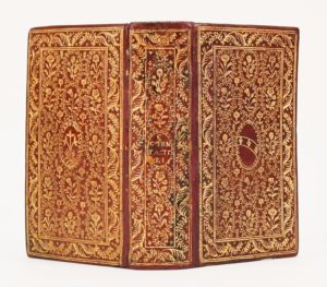 (1584). TACITE. OPERA OMNIA. J. Lipsius denuo castigavit. Lyon, Antoine Gryphe, 1584. In-16 de 906-[52]-2bl. pages, maroquin rouge, encadrement sur les plats et au dos d'une bordure de feuillages, grand semis de médaillons ovales de feuillages sur les plats contenant chacun une fleur, armoiries au centre, filet sur les coupes, tranches dorées (reliure de l'époque). BEL EXEMPLAIRE, RÉGLÉ, DANS UNE RAVISSANTE RELIURE AUX ARMES DE PIETRO DUODO (1554-1611), ambassadeur de la République de Venise à la cour d'Henri IV de 1594 à 1597. Ce bibliophile possédait une bibliothèque portative dont tous les livres étaient reliés de la même manière, seule la couleur du maroquin variait en fonction des thèmes : le vert olive était réservé aux ouvrages de littérature, le citron à la médecine et la botanique, et le rouge à l'histoire, la philosophie. Ces reliures étaient autrefois attribuées à l'atelier des Ève et on a longtemps pensé, à cause de la présence d'une marguerite parmi ce décor fleuri très caractéristique, qu'elles avaient été réalisées pour la reine Marguerite de Valois. Très bel exemplaire, la reliure a conservé tout son éclat, menus défauts. De la bibliothèque Léon Rattier avec son ex-libris doré sur cuir rouge. (Baudrier VIII, 388) (USTC 142144).