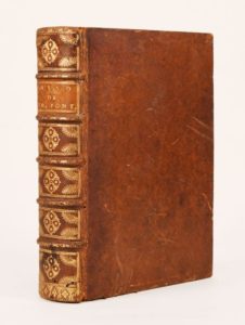 (1586). MASSON (Papire). LIBRI SEX DE EPISCOPIS URBIS, qui Romanam Ecclesiam rexerunt, rebusque gestis eorum... Paris, S. Nivellium, 1586. In-4° de [4]-411 (chiffr. 421)-24 feuillets, basane, dos à nerfs orné (reliure du XVII°). Première édition de l'Histoire des Papes depuis Saint Pierre jusqu'à Grégoire XIII (mort en 1585), composée par l'humaniste J.-P. Masson (1544-1611), dans laquelle il décrit les ruines et les inscriptions de Rome avec une grande exactitude. Dédiée à Henri III, elle est illustrée d'un grand bois à pleine page et de nombreuses lettrines ornées. Piqures sur les premiers feuillets, tampon sur la garde, ex-libris manuscrit daté de 1720 (Pierre-François Perrey), un portrait ajouté.
