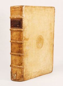 (1586). DALECHAMPS (Jacques). HISTORIA GENERALIS PLANTARUM. Lyon, G. Rouille, 1586. Fort volume in-folio de [12]-1095-1bl. pages, velin rigide, plats armoriés, dos à nerfs orné (reliure de l'époque). Première édition rare. Dans son avis (en latin) au lecteur, le célèbre imprimeur révèle qu'il a conçu l'idée de publier cet ouvrage lors une visite faite, il y a de longues années, aux collections amassées par J. Dalechamps, né à Caen en 1513 et mort à Lyon en 1588. Cet ouvrage a longtemps joui d'une grande réputation; il renferme dans les 2 livres de ce premier tome, près de 1000 FIGURES GRAVEES SUR BOIS de plantes et d'insectes, lesquelles ont figuré pour la première fois dans une édition lyonnaise de 1579 des commentaires de Matthioli. Quelques feuillets brunis uniformément, exemplaire entièrement réglé à l'encre rouge, cachet d'un collège religieux au titre, une table ancienne de Linné est jointe (8 pages manuscrites). (Baudrier IX, 397 et 403) Tome premier seul (sur 2) aux Armes de Mathieu Mazenod, marchand bourgeois de Saint-Chamond (Loire). (O.H.R., pl. 1520).
