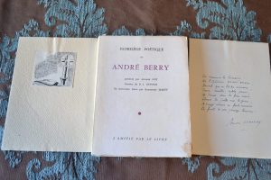 Berry (André) - Florilège poétique. Blainville sur mer, L'amitié par le livre, s.d.. In12, broché, 94 pp. signé par l'auteur, dessins de R.L. Dufour, buste en HT de Raymonde Marty. Ex n°3 sur papier levé sur forme à la main du moulin du...