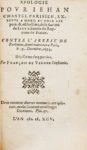 (1595). VERONE (Jean BOUCHER dit). APOLOGIE POUR JEHAN CHASTEL, parisien, exécuté à mort, et pour les pères et escholiers de la Société de Jésus, bannis du Royaume de France. Sans lieu, ni nom, 1595. In-12 de [12]-253 (chiffr. 243)-[3] pages, maroquin rouge, triple filet doré sur les plats, dos orné, tranches dorées (reliure du XVIII°). Célèbre factum paru sous un pseudonyme. Jehan Chastel fut condamné à mort pour tentative d'assassinat du Roi Henri IV. « En la chambre de la Dame de Liencourt (Gabrielle d'Estrée) le 27 de Décembre, Jehan Chastel âgé de 19 ans se coula dedans... et d'un cousteau qu'il avoit, pensant luy donner dans la gorge, le frappe en la bouche, et luy rompt une dent... ». Quelques rousseurs sinon très bel exemplaire. De la bibliothèque Girardot de Préfond avec son ex-libris (n°1237 de son cat. de 1757). (Brunet V, 1146).