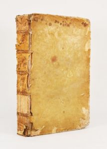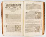 (1602). VALERIANO (Pierio). HIEROGLYPHICA, SEU DE SACRIS ÆGYPTIORUM aliarumque gentium literis commentarii - Pro sacerdotum barbis. Lyon, Paul Frellon, 1602. 2 parties de [16]-644-[44]-47-[2] pages en un volume in-folio, basane brute jaune (reliure de l'époque). Portrait gravé. Giampietro Valeriano Bolzani, dit Pierio Valeriano (1477-1558) a constitué avec ses commentaires une véritable encyclopédie explicative des symboles, illustrée de près de 300 JOLIS BOIS GRAVES dans le texte. Le premier livre offre les significations hiéroglyphiques de tous les animaux: lions, autruches, dauphins, pélicans... Le second, plus éclectique, traite de la physionomie des humains, des habillements, des outils, des arbres, des légumes et fruits, de la navigation et des vaisseaux sur le Nil, des armes, de la pierre, du papier... Dos inexistant, reliure accidentée, rousseurs. (Caillet 10978).