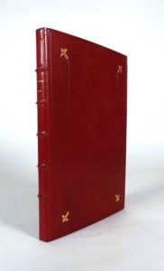 [PATHELIN]. MAISTRE PIERRE PATELIN. Sans lieu, sans nom. Manuscrit petit in-4° de 50 ff. non chiffrés, maroquin framboise, filets à froid encadrant les plats, fleurons dorés aux angles, dentelle intérieure, dos à nerfs, tranches dorées (Ateliers Laurenchet). Belle copie manuscrite du milieu du XX° siècle, sur papier ancien, à l'encre sépia, de l'édition gothique imprimée par Guillaume Le Roy (vers 1485-1486), à laquelle ont été ajouté 9 figures sur bois également copiées à la plume, provenant d'autres éditions (incunables ou du début du XVIe siècle). La marque de l'Atelier à l'Arbre blessé figure à la fin, accompagnée du numéro d'ordre XV. Page de titre jaunie, piqûres éparses. Bel exemplaire parfaitement relié, de la bibliothèque Guy Bechtel avec son ex-libris.