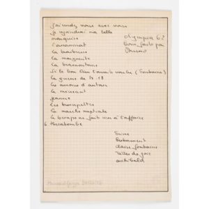 BRASSENS (Georges). [Liste manuscrite autographe, pour un tour de chant à l'Olympia en 1962]. 1 p. sur papier à petits carreaux, doublée de papier fort, et bords coupés. Liste autographe des 16 chansons prévues pour le tour à l'Olympia en 1962, dont plusieurs enregistrées cette année-là : "J'ai rendez-vous avec vous, Je rejoindrai ma belle, Marquise, L'Assassinat, La Traîtresse, La Marguerite, La Tramontane, Si le bon Dieu l'avait voulu, La guerre de 14-18, Les Amours d'antan, Le Mécréant, Jeanne, Les Trompettes, La Marche nuptiale, Le Temps ne fait rien à l'affaire, Hécatombe". Avec une liste complémentaire de 5 titres : "Prière, Testament, Claire fontaine, Filles de joie, Archibald". Expert : Ségolène Beauchamp