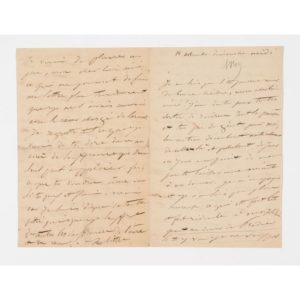 DROUET (Juliette). LAS adressée à Victor Hugo, 18 novembre (1849). 4 pages in-8. Juliette souffre d'être délaissée. "Quand au dîner de Pradier (...) je veux qu'il soit bien entendu que tu vas chez cet homme pour ton plaisir et malgré la certitude de m'affliger et de m'inquiéter mais au moins ne fais pas cette profanation de te servir de linceul de ma pauvre fille pour cacher les plaisirs équivoques que tu vas chercher chez Pradier. Maintenant je te supplie de ne plus m'en parler. Fais ce qui te plaît sans dissimulation ce me sera moins douloureux peut-être qu'en y ajoutant la tromperie honteuse et impie dont tu voulais te servir. Quand je pense à toutes les choses tristes qui m'enveloppent de toutes parts je m'étonne d'avoir le courage de vivre." Expert : Ségolène Beauchamp