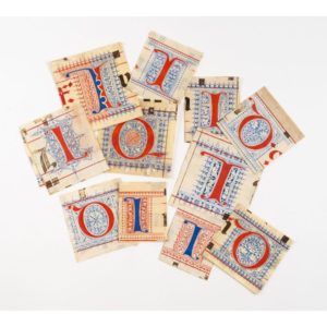 [ENLUMINURE]. [LIVRE DE CHŒUR]. Ensemble de 12 initiales ornées extraites d'un livre de chœur avec musique notée carrée, provenant toutes d'un même codex. Tempera et encre sur parchemin. Italie, Florence (?), vers 1450-1475. Dimensions variables, la plus grande : 110 x 115 mm ; la plus petite : 75 x 85 mm Bon état général ; traces de colle au dos des fragments. Cet ensemble comprend 5 initiales Q et 7 initiales I. Ces initiales peintes en rouge ou bleu sont rehaussées d'un décor filigrané et orné de couleur bleu ou rouge, de grand module. Ces initiales rappellent celles associées aux manuscrits réalisés pour la Badia Fiorentina, église Santa Maria Assuntanella, fondation bénédictine à Florence liée par la suite au XVe siècle à la congrégation Sainte-Justine-de-Padoue. Voir par exemple 15 feuillets décrits et vendus à Londres, Sotheby's, 22 juin 1999, lot 83. Expert : Ariane Adeline