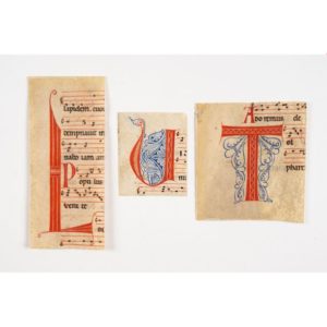 [ENLUMINURE]. [LIVRE DE CHŒUR]. Ensemble de 3 initiales ornées extraites d'un livre de chœur. Musique notée carrée sur des portées tracées en rouge de 4 lignes. Tempera et encre sur parchemin. France ou Italie (?), fin du XIIe siècle (?). Initiale L, dimensions : 73 x 167 mm ; Initiale T, dimensions : 105 x 113 mm ; Initiale N, dimensions : 65 x 80 mm. Bon état général, quelques traces de colle au dos. Ces initiales ont été réalisées dans un style monochrome qui rappelle les manuscrits cisterciens du XIIe et XIIIe siècle et notamment les styles monochromes pratiqués à Cîteaux et dans les monastères affiliés. Les présentes initiales sont réalisées en rouge avec des motifs réservés évoquant la technique du pochoir et sont agrémentées d'un décor filigrané en bleu, tranchant avec l'initiale monochrome. Expert : Ariane Adeline