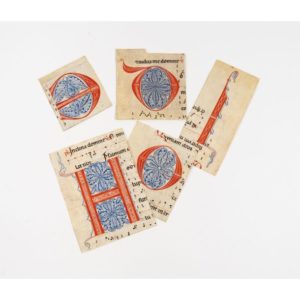 [ENLUMINURE]. [LIVRE DE CHŒUR]. Ensemble de 5 initiales ornées extraites d'un livre de chœur Musique notée carrée sur des portées tracées à la pointe sèche et une ligne en rouge. Tempera et encre sur parchemin. France (?), fin du XIIe siècle (?) Initiale D, dimensions : 97 x 105 mm ; Initiale Q, dimensions : 108 x 110 mm ; Initiale E, dimensions : 75 x 85 mm ; Initiale I, dimensions : 70 x 154 mm ; Initiale H, dimensions : 105 x 142 mm Bon état général, quelques traces de colle au dos. Ces initiales proviennent d'un livre de chœur (antiphonaire très certainement) qui trahit une esthétique minimaliste cistercienne mais avec un décor à la plume de couleur bleue assez foisonnant qui vient sublimer les initiales monochromes rouge au décor sobre. Le décor rappelle certains manuscrits peints pour l'abbaye de Pontigny (Yonne), voir par exemple les initiales d'un manuscrit de Bède le Vénérable (vers 1164-1166) (Auxerre, BM, MS 14). Expert : Ariane Adeline