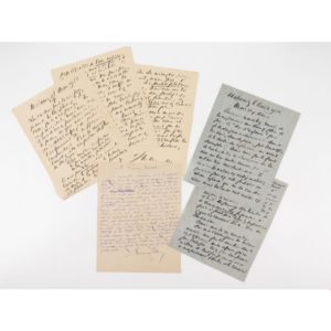JAMMES (Francis) et GODOY (Armand). 2 LAS et un poème. - JAMMES (Francis). LAS au poète d'origine cubaine Armand Godoy, datée 18 mai 1928. 3 pp. in-4. Belle lettre mystique. Jamme moralise, conseille, responsabilise et rassure son ami : "Que t'a donc fait la vie pour qu'ainsi tu blasphèmes ? Je t'assure que ce n'est pas ça. Tu es, je suis, il est, nous sommes, ils sont de vieux parchemins, la peau sur quoi nous écrivons par les détails raffinés du péché le raffinement du supplice correspondant (…). Ce n'est pas Lui, c'est nous le bourreau, le justicier (...)". Jammes évoque un "démon contagieux" que "des feuilles comme [la revue] Commerce propagent"... - JAMMES (Francis). LAS à Armand Godoy, datée 6 août 1934. 3 pp. in-4. Lettre à la fois poétique, mystique, amicale, critique : "Aucune nouvelle neuve de toi ne pouvait me donner plus de joie (...). J'ai confiance en Dieu (...). Il faut attendre mais tu le sais aussi bien que moi maintenant que tu fais profession de catholique (...). J'ai lu un numéro de Marianne dont le directeur [Emmanuel] Berl est un juif qui fabrique des lits mécaniques. Cela sent le soufre. L'Antéchrist n'est pas loin.". - GODOY (Armand). Poème en prose autographe signé, dédié à Francis Jammes. 1 p. in-4. "Ta Caravelle évocatrice m'a transplanté à la fois dans le sauvage et parfumé débarcadère de mes rêves d'enfant et dans l'éblouissement de ton cher paysage basque. (...) Et me voici blotti sur ton cœur harmonieux, le front caressé par ta barbe de patriarche." Expert : Ségolène Beauchamp