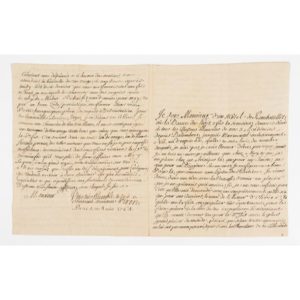 PIRON (Alexandre) (1689-1773), poète et auteur dramatique L.A.S. d'Alexandre Piron adressée à Jacques Cazotte Lettre en français, sur papier Paris, 4 août 1764, 4 pages in-4 Lettre signée " Votre tres humble & tres obeissant serviteur Piron " Dimensions : 225 x 182 mm Belle et spirituelle lettre d'Alexis Piron. " Je sors, Monsieur, d'un Hôtel de Rambouillet, où la dame du Logis, 2 fois par semaine, donne a dîné à tous les illustres parasites de nos trois Académies depuis Dalembert jusqu'à Marmontel… ". Il a un échange avec son hôte : " C'est qu'elle m'a demandé avec un empressement qu'elle n'a que pour ses convives le nom de l'auteur d'Olivier & qu'elle me l'a fait orthographier tres exactement pour le faire graver à la tête de son exemplaire ; en m'avouant qu'elle venoit de vous lire pour la 3eme fois avec le plus grand plaisir du monde : plaisir, que selon toutte apparence, ne lui ont pas encore procuré, depuis 15 ans, les Chevaliers de sa Table ronde… ". Jacques Cazotte (1719-1792) avait publié en 1763 son ouvrage Ollivier : le lord impromptu ( Piron évoque Voltaire, chassé des Champs-Elysées " à coups d'étrivières, pour y avoir grossièrement & méchamment insulté les auteurs de Radamiste & de Rodogune, ses maîtres ". Piron évoque aussi Laharpe. Expert : Ariane Adeline