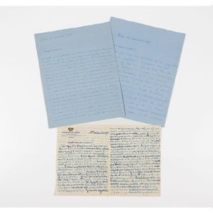 PORCHÉ (François). 3 LAS à la comédienne Madame Simone, qu'il épousera en 1924. - 11 nov. 1918, 2 pp. in-4, saisissant témoignage sur la fin de la guerre : "Mon amour, à midi j'ai entendu un carillon lointain dans la direction de Gisors. J'ai ouvert ma fenêtre et crié à Valloussia : "La guerre est finie." (...) Et des pétards éclataient dans le village pendant toute la soirée. (...) En dehors des répétitions, repose-toi, mon amour. Et prends bien des précautions. Apollinaire est encore mort de la grippe, en 2 jours." - 12 nov. 1918, 2 pp. in-4. Il s'inquiète de ne pas avoir de nouvelles et réfléchit déjà à cet armistice : "Il semble que ces manifestations spontanées aient atteint une ampleur tout à fait extraordinaire. On ne parle pas de désordre. Qu'il faut que les morts soient vite oubliés cependant pour que la joie ait pris ce caractère tumultueux ! (...) On se demande seulement comment certaines conditions en pourront être appliquées dans l'état actuel de l'Allemagne…". - 1er déc. 1925, 4 pp. in-8, papier à en-tête du Washington Hôtel. Son "amour adoré" est en tournée : "Je suis heureux du triomphe. Après l'Italie, l'Égypte. Tout le monde veut de mon cher Pousset." Il lui donne des nouvelles diverses, programme leurs retrouvailles à Rome et leur déjeuner chez "gros pigeon [qui] radote tout de même : à 3 jours de distance il me fait relire des vers de Théophile Gautier sur l'album d'Elisa". Il lui adresse les poèmes qu'il fait et son article sur les femmes dans L'Illustration a été publié le 28. Expert : Ségolène Beauchamp