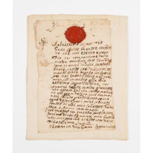 GIULIANI (Véronique, sainte) (1660-1727) Lettre spirituelle contenant une prière adressée à la Sœur Anna Maria Giuliani (résidant à Mercatello) S.l.n.d. (fin XVIIe s. ?), 1 p. avec adresse au verso. Document sur papier, en italien ; document fixé sur un feuillet blanc sur la portion supérieure permettant tout de même la lecture du verso ; sceau de cire rouge en tête de document Signature : " Veronica Giuliani cappuccina ". Dimensions : 194 x 134 mm Née à Mercatello (province de Pesaro et Urbino dans les Marches), Veronica Giuliani est une sainte mystique et une des grandes représentantes de la spiritualité de l'époque baroque. Elle écrit un journal intitulé Il Tesoro nascosto (Le trésor caché), qui comporte plus de 22 000 pages manuscrites, dans lequel elle fait état de ses stigmates aux mains, aux pieds et au côté. Elle entre au couvent des Clarisses de Città del Castello dont elle deviendra abbesse en 1716. Son procès en béatification commence en 1727, dès son décès. Incipit, " Soleissimo signor moi Jesu Christo mentre considero che voi eterno et vero Dio… ". Au verso, on lit l'adresse à " Anna Maria Giuliani ", certainement membre de la famille de la sainte. Expert : Ariane Adeline