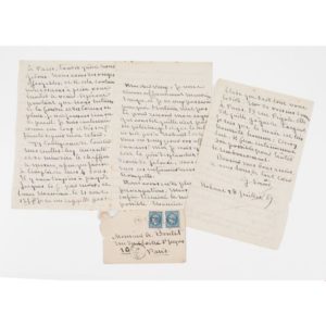 SAND (George). LAS, à son ami et homme de confiance André Boutet, Nohant, 28 juillet 1867. 6 pages in-8, avec env. "Mon cher vieux, je vous trouve affreusement mauvaise langue, et je ne veux pas savoir pourquoi Hortense n'est pas là pour recevoir mon argent. Qui vous dit qu'elle n'est pas en pèlerinage ? Et que le docteur ne soit pas à Nohant ? Ah ? Vous en seriez pour vos affreux cancans !". Elle expose ensuite l'arrangement avec son ancien mari Casimir Dudevant et leurs enfants : "Enfin mes enfants en sont sortis, s'en sortir de leur dignité. Ils ont fait signer un traité qui les maintient dans leurs droits que leur confère le premier jugement. Ils sauvent pour l'avenir tout ce qui reste de la fortune, un tiers environ et ils assurent à leur père l'usufruit de ce débris, moyennant quoi il pourra ne pas tomber dans la misère à moins qu'on ne le fasse mourir de faim pour lui arracher son revenu. Il est aussi malheureux que coupable, mais il n'y a pas moyen de le soustraire à son sort." Expert : Ségolène Beauchamp