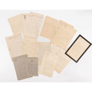 [ZOLA (Emile)]. Ens. de 15 lettres et billets autographes adressés à Emile Zola, par des personnalités du monde des lettres et journalistes. 1873 - 1900. - Joseph Barthélémy, 18 mars 1886 (1 p. et demie) sur L'Assommoir au théâtre. - Georges Brisson (2 lettres), admirateur nantais : 19 avril (2 pp.) et 7 septembre 1876 (3 pp.). " J'aurais ainsi le bonheur immense de voir au moins une fois dans ma vie celui que j'étudie et j'admire depuis que j'ai l'âge de raison (...) ". - Camille Doucet (2 lettres), poète et auteur dramatique, académicien, directeur de l'administration des théâtres : 20 février 1892 (2 pp.) et 1 er avril 1894, sur des affaires de l'Académie. - André Fourchy, notaire : 3 avril 1900 (1 p.). Formalités pour la succession de Jules de Goncourt. Il demande à Zola de bien vouloir "signer comme témoin un acte de notoriété constatant que M. Jules de Goncourt n'avait qu'un frère et un seul héritier". - Gustave Geoffroy, journaliste et critique d'art, un des dix membres fondateurs de l'Académie Goncourt (1874), (1) p. - André Gill, caricaturiste : 12 août 1873 (1 p. et demi). Fait part de son admiration sur la version théâtrale de Thérèse Raquin. Petites déchirures restaurées par un adhésif. - Georges de Labruyère (2 lettres), rédacteur du Cri du peuple : 4 février 1887 (1 p.) et 14 février 1887 (1 p). Il est question du Ventre de Paris porté au théâtre - Erik Lie, écrivain norvégien : 14 novembre 1889 (2 pp.). Il veut traduire La Bête humaine en norvégien. "J'ai l'occasion de suivre la littérature française contemporaine en même temps que j'étudie la littérature ancienne". - Pierre Loti, s.d. (1 p. et 3 l.). Remerciements pour le " beau livre " qu'il vient de recevoir et dont il le remerciera de vive voix très bientôt. - Suzanne Manet, veuve du peintre : 11 octobre 1886 (2 pp.). Elle l'invite à recevoir Jean Thorel " jeune littérateur et un de vos admirateurs les plus ardents auquel je m'intéresse ". - Catulle Mendès (2 lettres) : 29 mai 1888 (1 p.) et 20 juin 1888 (2 pp). Directeur de la Vie populaire, il évoque la publication à venir du Rêve : " La Vie populaire, si vous le voulez bien reproduira tous vos romans nouveaux ". Expert : Ségolène Beauchamp