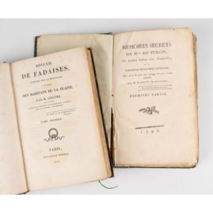 BARTHELEMY (Abbé Louis)]. Mémoire secrets de Mme de Tencin, ses tendres liaisons avec Ganganelli. S.l., s.n., 1790. 2 parties en un vol. In-8, cartonnage de l'époque, dos lisse orné. Édition originale rare de ces faux "mémoires" inspirés des fresques amoureux de Mme de Tencin, grenobloise et mère de Jean d'Alembert. Ex-libris A. Jouffray. On joint : FRANÇAIS DE NANTES (Antoine). Recueil de Fadaises, composé sur la montagne à l'usage des habitants de la plaine par M. Jérôme. Paris, Bossange frères, 1826. 2 tomes en un vol. in-8, bradel percaline brune, pièce de titre rouge (Rel. moderne). Édition originale. Rousseurs. 2419/56 BARTHELEMY (Abbé Louis)]. Mémoire secrets de Mme de Tencin, ses tendres liaisons avec Ganganelli. S.l., s.n., 1790. 2 parties en un vol. In-8, cartonnage de l'époque, dos lisse orné. Édition originale rare de ces faux "mémoires" inspirés des fresques amoureux de Mme de Tencin, grenobloise et mère de Jean d'Alembert. Ex-libris A. Jouffray. On joint : FRANÇAIS DE NANTES (Antoine). Recueil de Fadaises, composé sur la montagne à l'usage des habitants de la plaine par M. Jérôme. Paris, Bossange frères, 1826. 2 tomes en un vol. in-8, bradel percaline brune, pièce de titre rouge (Rel. moderne). Édition originale. Rousseurs. Expert : Ségolène Beauchamp