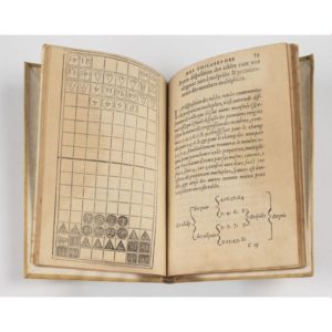 [BOISSIÈRE (Claude de)]. Le Très excellent et ancien jeu Pythagorique, dit Rithmomachie. Paris, Guillaume Cavellat, 1556. Petit in-8, 52 ff., vélin moderne, dos muet. Seconde édition française, après celle de 1554, de ce rare ouvrage rithmomachie, jeu fameux depuis le XIe siècle ; illustré de figures dans le texte, c'est le premier traité sur ce jeu de stratégie mathématique, qui utilise un plateau, comme les échecs. Certains feuillets courts en tête, avec titre ou gravure parfois atteints. Ex. lavé, avec quelques lettres reprises à la plume, tache marginale pâle. Expert : Ségolène Beauchamp