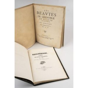 BURLESQUE. - ANONYME. Les Beautés de Grenoble en platte peinture. Ode burlesque. Par L. T. Grenoble, Jean Nicolas, 1647. In-8, 22 pp., (1) f. blanc, bradel vélin à petit recouvrement, dos lisse, tête dorée (Stroobants). Maignien, Imprimerie, n°305. Édition originale rare de ce poème, dédié à Madame de Revel, resté anonyme : "Ou si savoir mon nom il vous importe, / Soyez certain que maint livre le porte, / Maint imprimeur en a pris des extraits, / Maintes maison en gardent les portraits." (p. 4). Pâles rousseurs. On joint : FAURE (J.). La Tallardiade, poème, en huit chants. Seconde édition, revue, corrigée et augmentée. Gap, J. Allier, 1839. In-8, demi-maroquin noir, dos à nerfs. Nouvelle édition (l'originale parut en 1819) de ce poème qui conte en vers "les faits et gestes du chartreux Dom Raymond, surnommé de Vars, pendant son séjour à Tallard" (Hautes-Alpes) : en 1816-1817, l'abbé Raymond exploita la crédulité des habitants de Tallard en se faisant passer pour riche et généreux. De la bibliothèque A. Jouffray, avec ex-libris. Expert : Ségolène Beauchamp