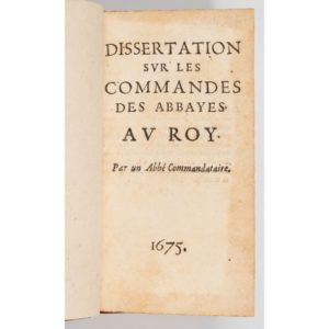 CHOLLIER (Bonaventure)]. Dissertation sur les commandes des abbayes. Au Roy. Par un Abbé Commendataire. S.l, s.n, 1675. In-12, (4) ff., 191 pp., veau moucheté, dos à nerfs orné, tranches jaspées (Rel. ép.). Édition originale rare de cet ouvrage traitant du régime de la commande qui permettait de distribuer à un ecclésiastique une abbaye ou un prieuré in commendum lui accordant ainsi le droit d'en percevoir les revenus. De la bibliothèque dauphinoise Eugène Chaper avec ex-libris. Expert : Ségolène Beauchamp