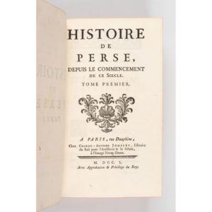 [CLAIRAC (Louis André de La Mamie de)]. Histoire de Perse, depuis le commencement de ce siècle. Paris, Charles-Antoine Jombert, 1750. 3 volumes in-12, veau brun, armes dorées sur les plats, dos à nerfs orné, pièce de titre bordeaux, tranches rouges (Rel. ép.). Édition originale et unique. Bon exemplaire, aux armes du duc d'Hostun, du Dauphiné (OHR, pl. 877, n° 2). Légères épidermures et tâches ; or des armoiries lég. passé. Expert : Ségolène Beauchamp